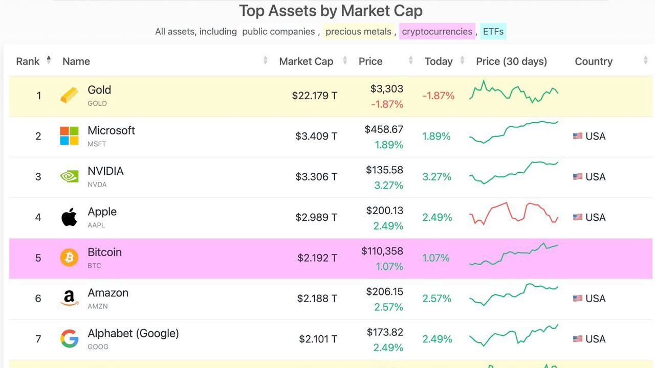 O Bitcoin, que existe há apenas 16 anos, já ocupa a 5ª posição entre os maiores ativos do mundo por valor de mercado.