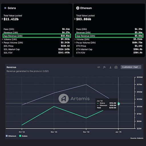 Ontem, a receita diária no ecossistema da Solana foi praticamente 6x maior que a do Ethereum. Comparando-se na base mensal, a blockchain da Solana acaba de alcançar o ETH.