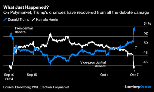 Essa reprodução é da Bloomberg, mas o conteúdo do gráfico é a probabilidade de eleição de Trump (azul) versus Kamala Harris (branco) no site de apostas Polymarket.
