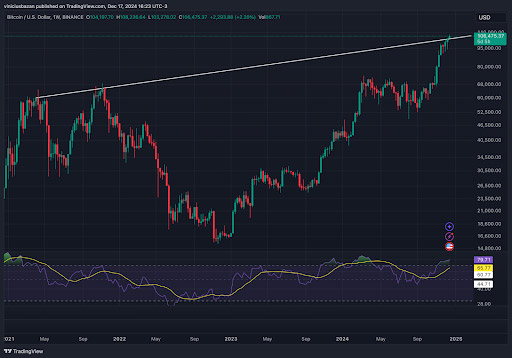 Uma linha de tendência que os investidores observam é esta do gráfico acima, projetando-se, no gráfico semanal, os topos de 2021 até agora. Isso nos traz a uma resistência em torno de US$ 103 a 105 mil.