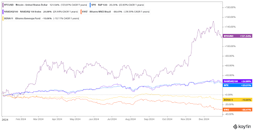Enquanto o Bitcoin se valorizou 121% em dólares em 2024, o S&P 500 (o maior índice de bolsa americano) subiu 23%, o Nasdaq (índice de ações de tecnologia) subiu 25% e o nosso Ibovespa, para variar fez feio, caindo 10% em reais e 30% em dólares (que horror).