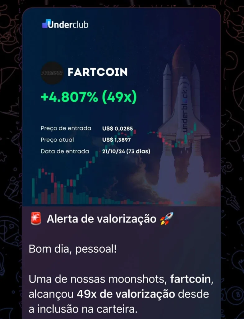 Se você ainda não está investindo nas moedas que recomendamos na Underblock, você provavelmente vai perder mais oportunidades de conseguir grandes multiplicações de patrimônio em um curto espaço de tempo, assim como aconteceu com a Fartcoin.