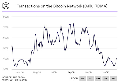 Esse mantra se aplica na prática e pode ser visualizado bem no nosso gráfico da semana, que mostra a quantidade de transações na rede do Bitcoin.