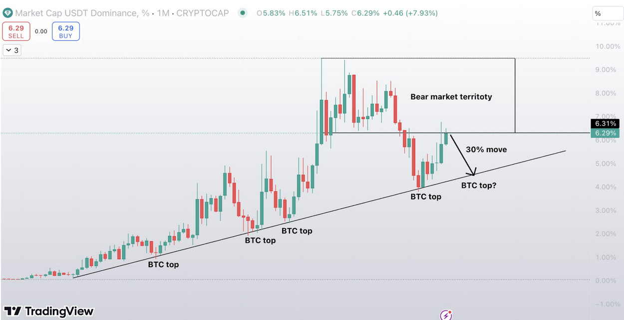 Só para garantir que você não se perca no conceito, a “dominância” é uma medida relativa… por exemplo, se o valor de mercado total do USDT for de US$ 120 milhões e o valor de mercado total das criptomoedas for de R$ 2 trilhões, a dominância do USDT será 6% (que é o R$ 120 milhões, dividido pelos US$ 2 trilhões).