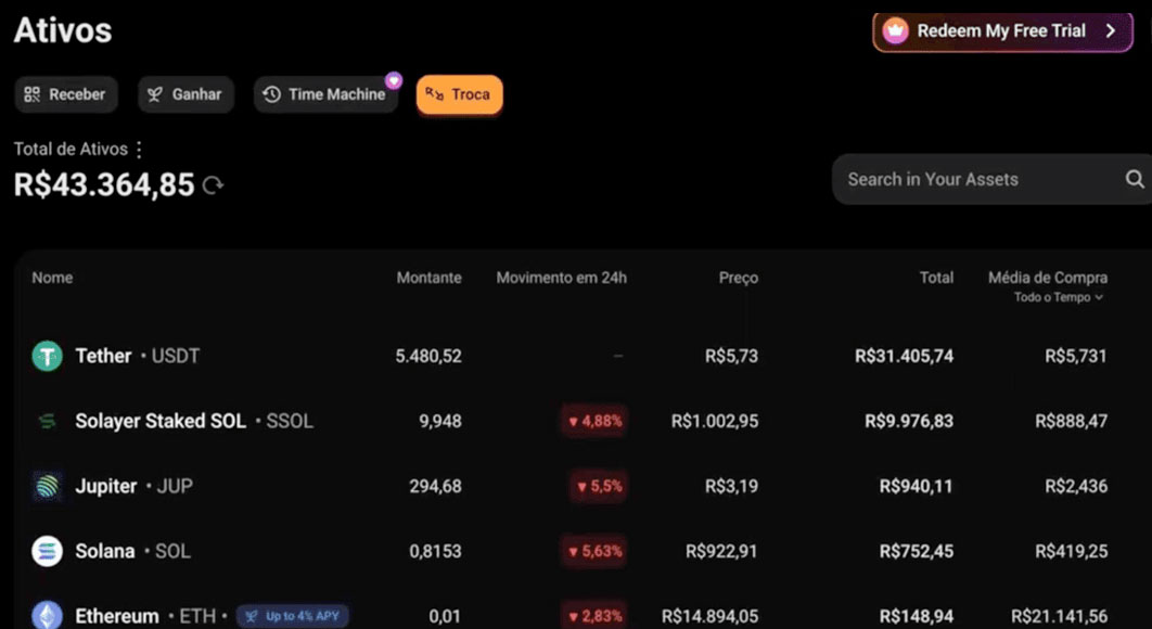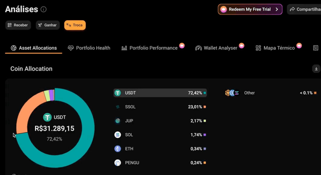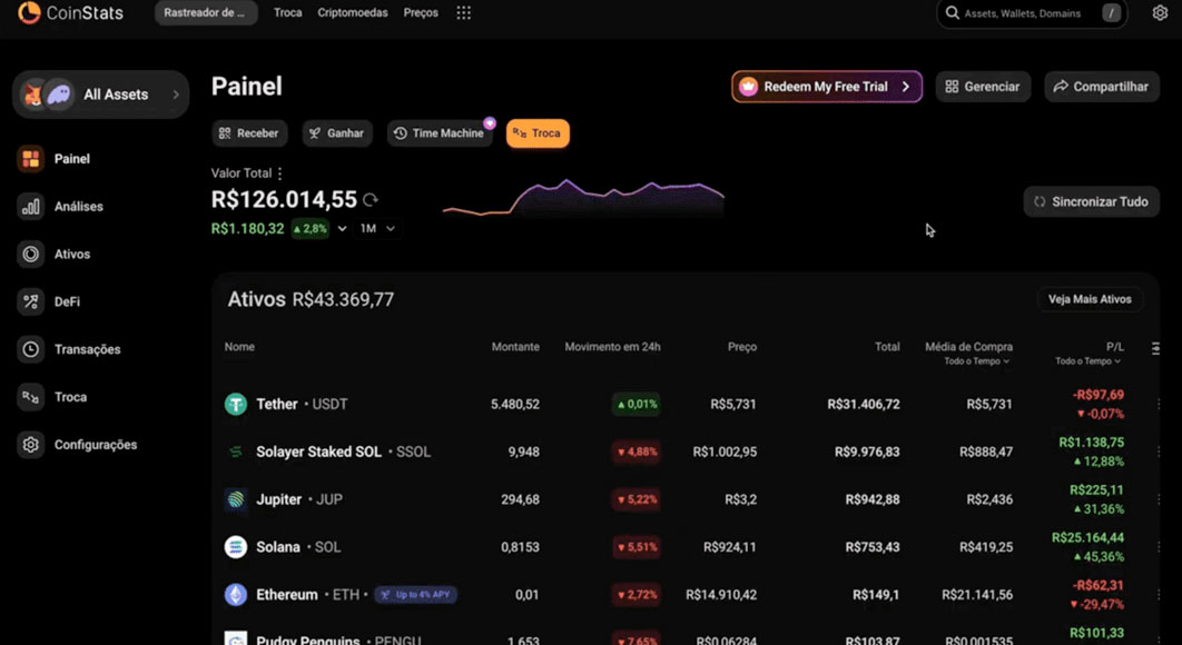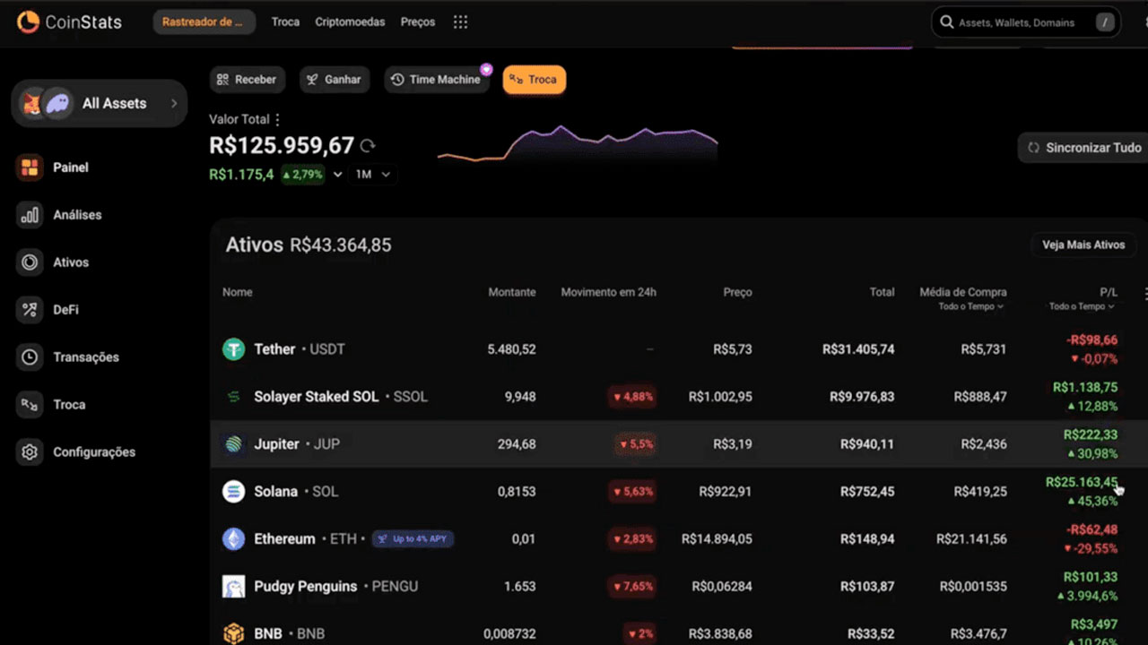 Depois de conectar tudo, você vai no “Rastreador de Criptomoedas” – e aqui é onde a mágica acontece.