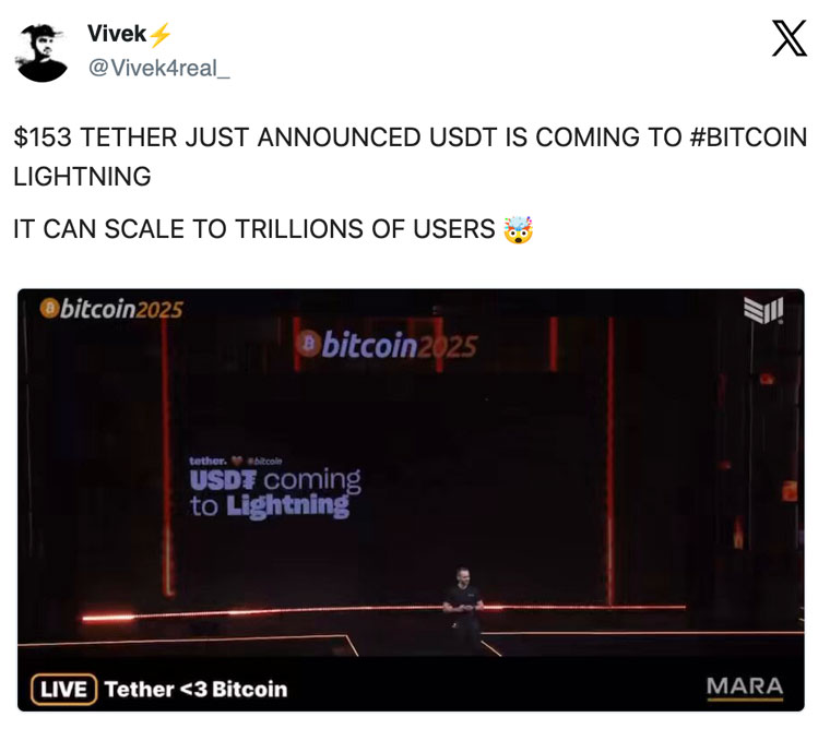 A Tether anunciou que o USDT está chegando à Lightning Network do Bitcoin. E olha só a escala: pode atender trilhões de usuários.