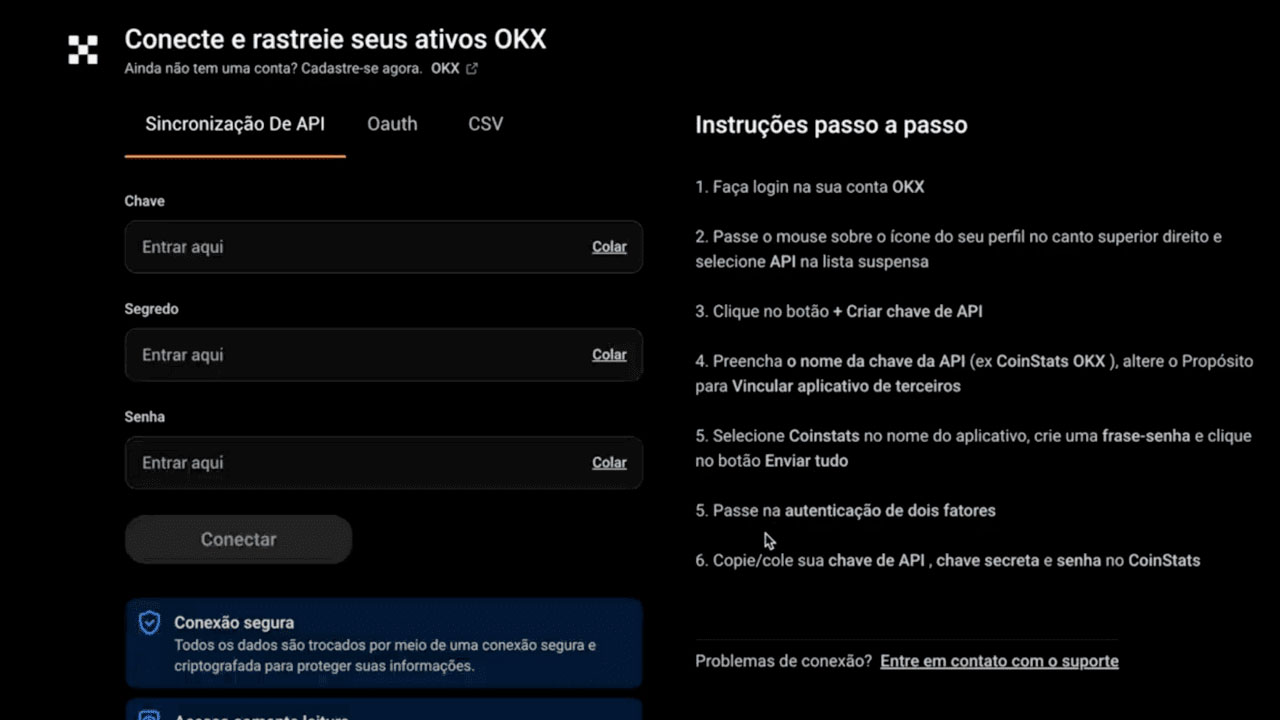 Quando você escolhe conectar a OKX, vai precisar criar uma chave de API.