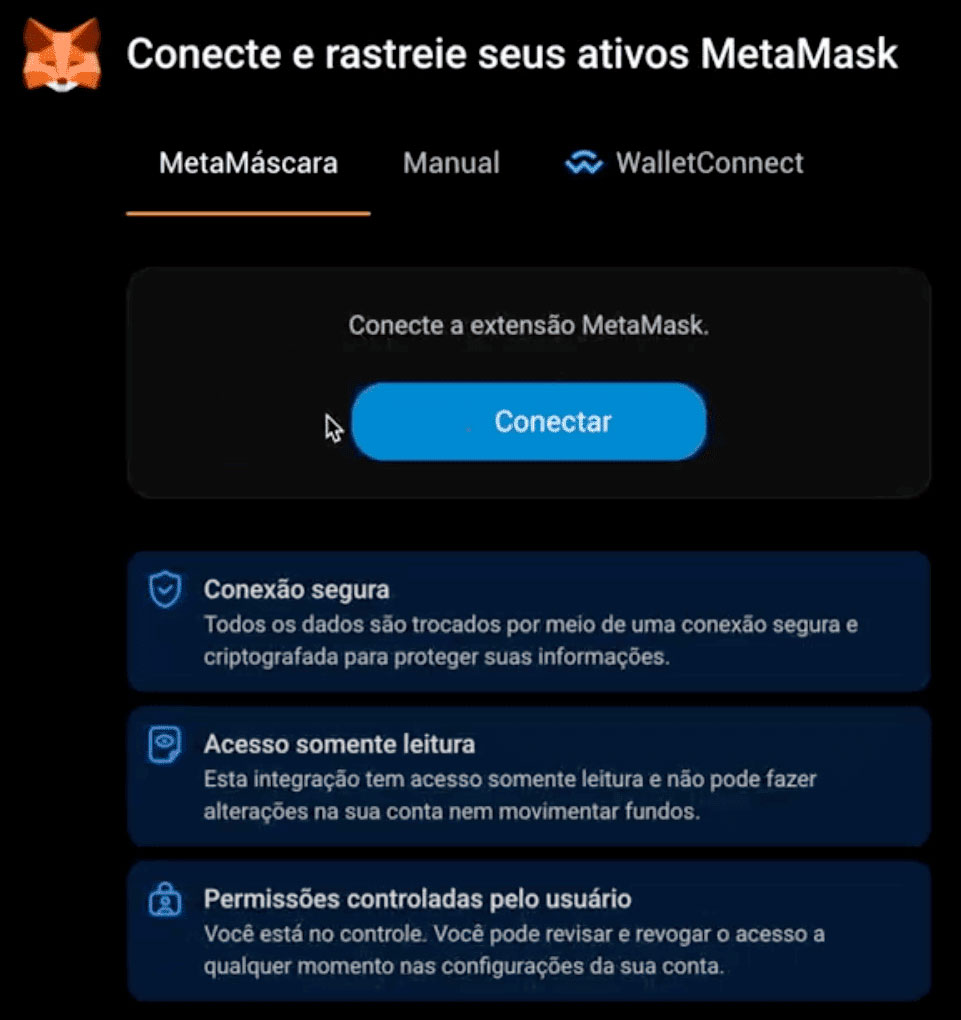 Observação: você permite acesso apenas à leitura dos seus dados e não a transações. No caso de wallets, essas informações já são públicas na blockchain. Já para exchanges, você está apenas informando seus saldos para consulta e consolidação.