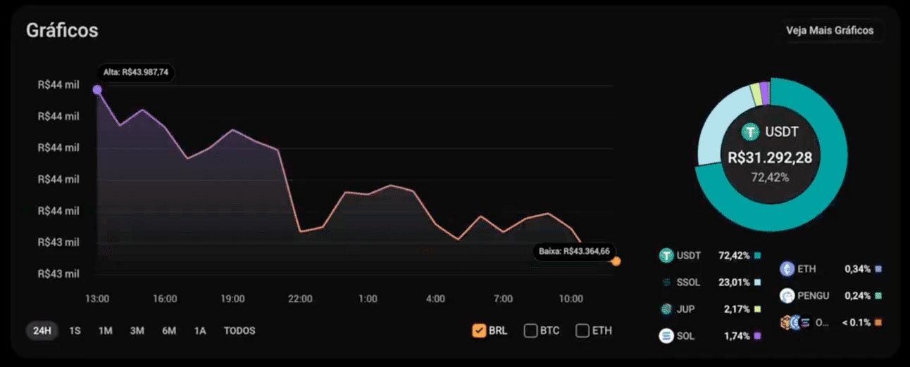 Você tem um gráfico de variação do seu patrimônio – em reais, mas você consegue trocar para outra moeda.