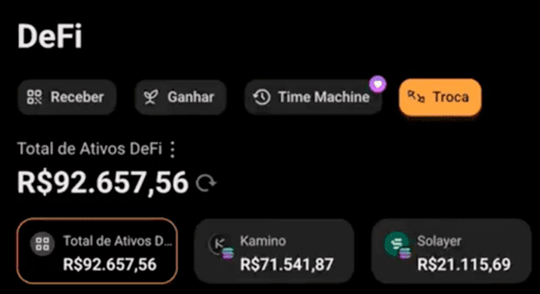 Em “DeFi” aparecem todos os tokens que estão travados em protocolos, pools de liquidez, staking…