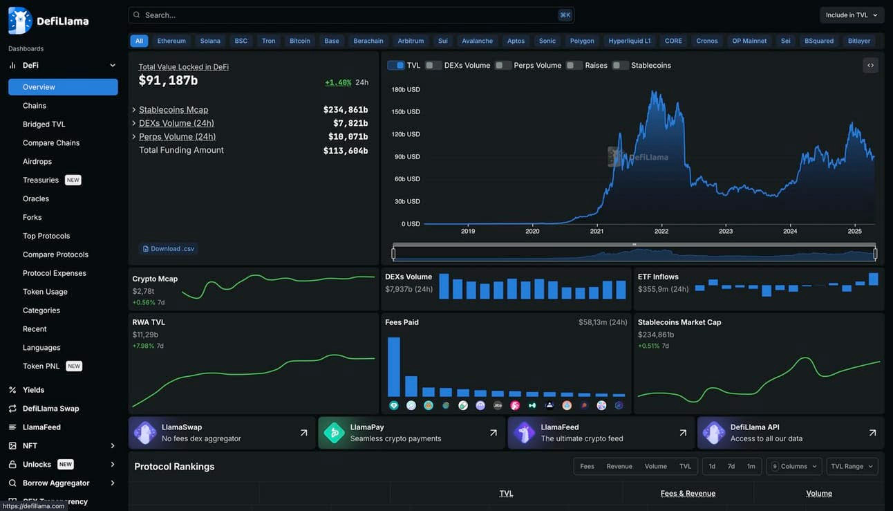 Quando você abre o DeFi Llama, consegue ver imediatamente: