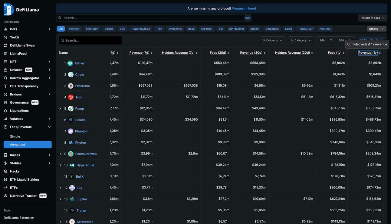 Gosto, em especial, da visão de Fees/Revenue (taxas e receita), na parte avançada. Posso ver quais protocolos estão gerando mais receita e sendo mais bem-sucedidos.