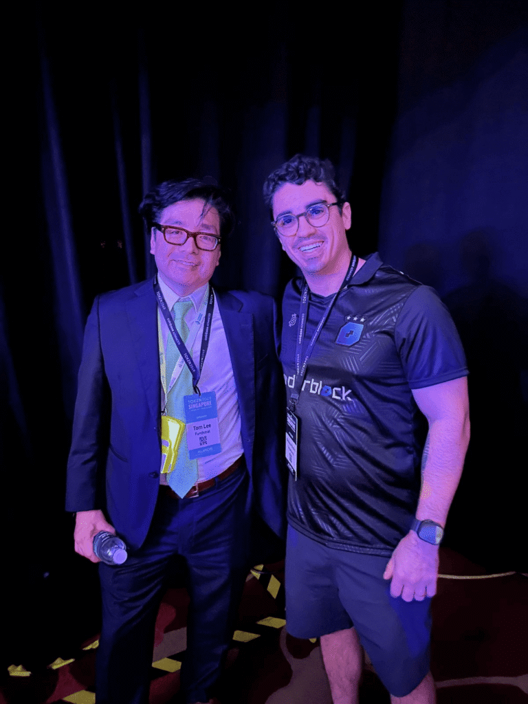 Tive a oportunidade de tirar uma foto com Tom Lee, da Fundstrat, antes da palestra.