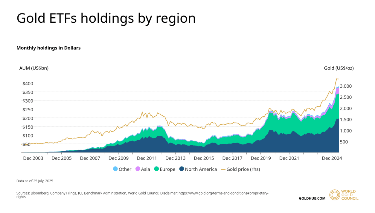 Os dados históricos mostram: à medida que o volume em ETFs de ouro cresceu, principalmente na América do Norte e Europa, o preço passou a responder com maior estabilidade às grandes operações.