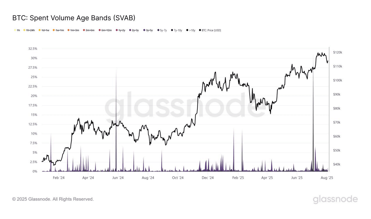 O gráfico de movimentações de carteiras antigas mostra que o pico recente – causado por essa venda de 80 mil BTCs – representou quase 30% dos bitcoins movimentados, mas foi pontual e já se normalizou para cerca de 1% do total.